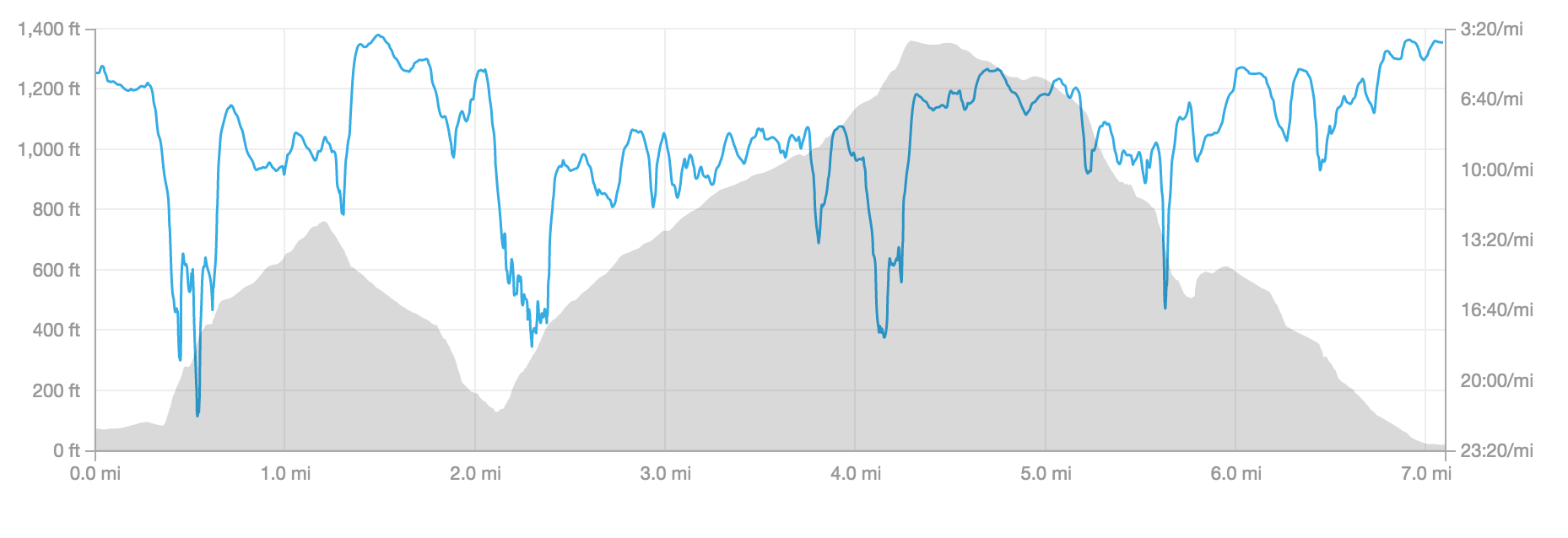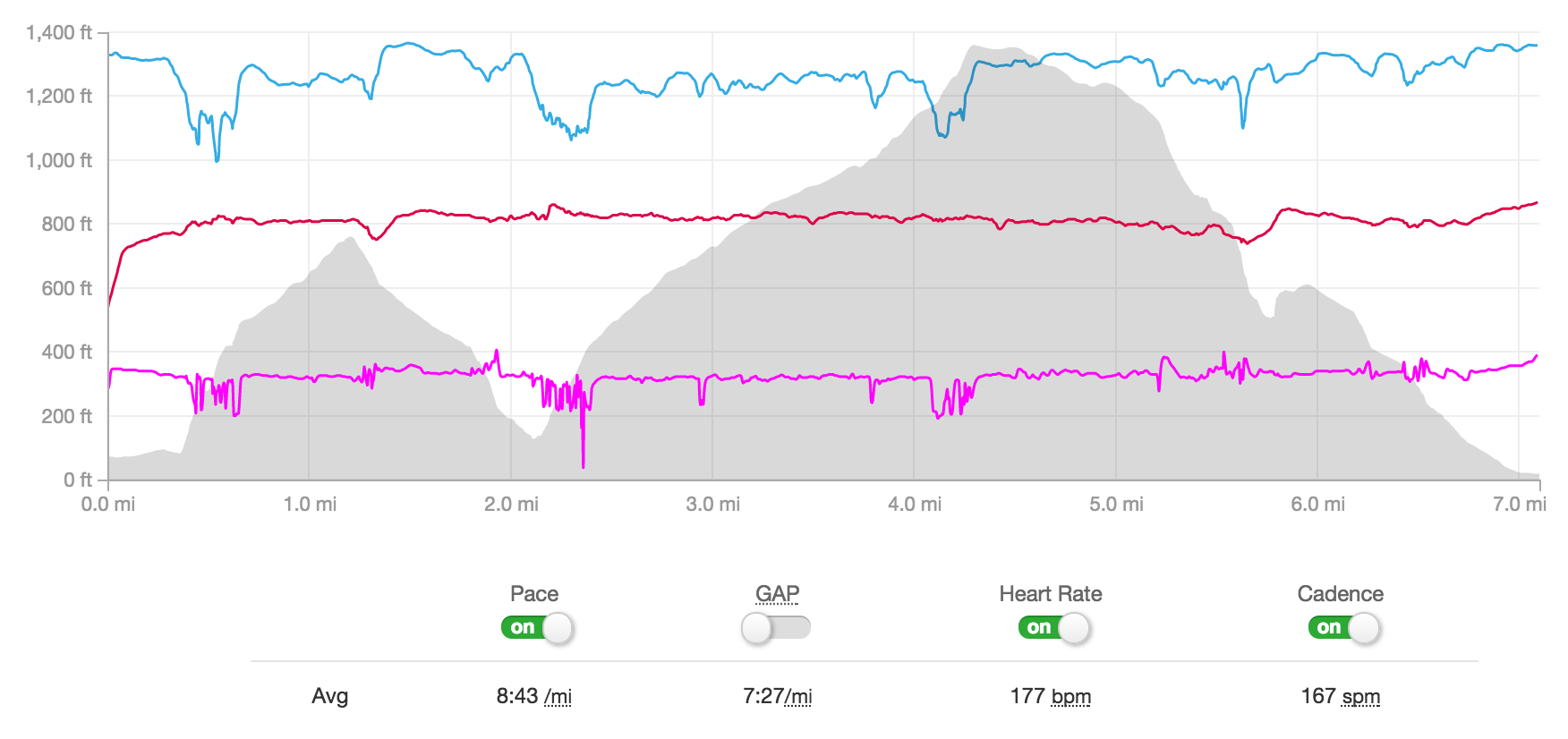 Looking at just heart rate I notice a slight downward trend from mile 2 through 5. Part of that is from exhaustion going uphill & the rest because once I started heading downhill my limiter was footing and not my heart, part of it was exhaustion. I clearly found a second wind though as I hit the final climb.