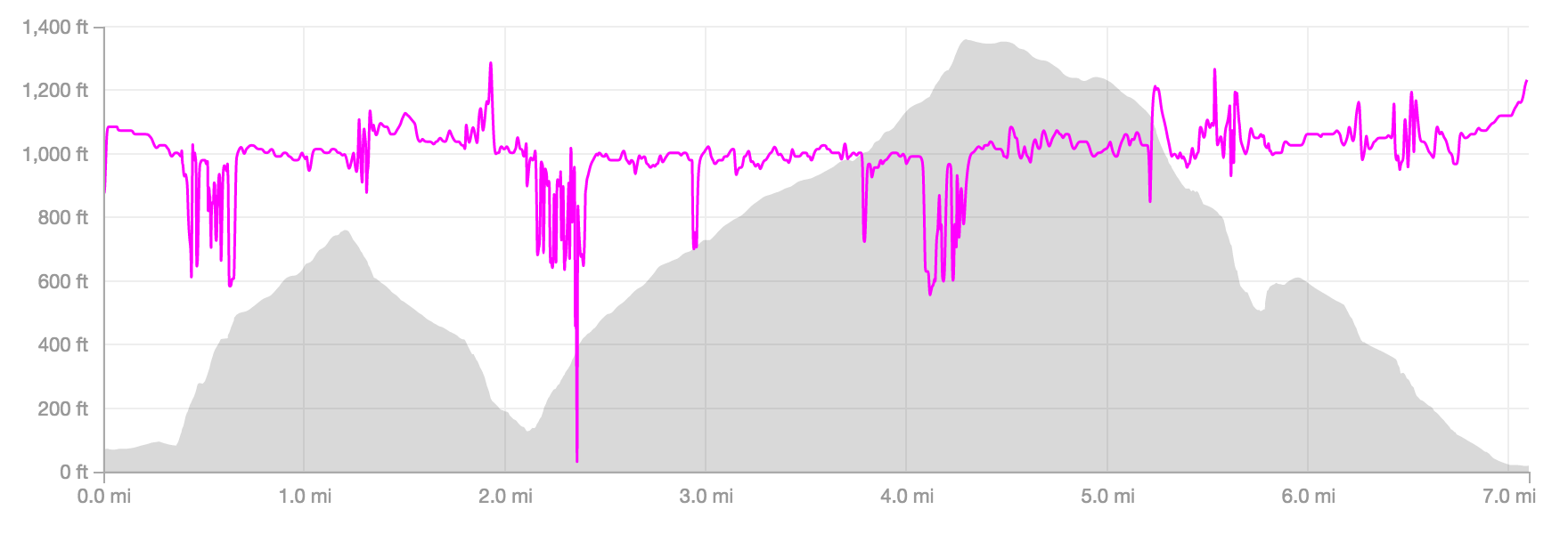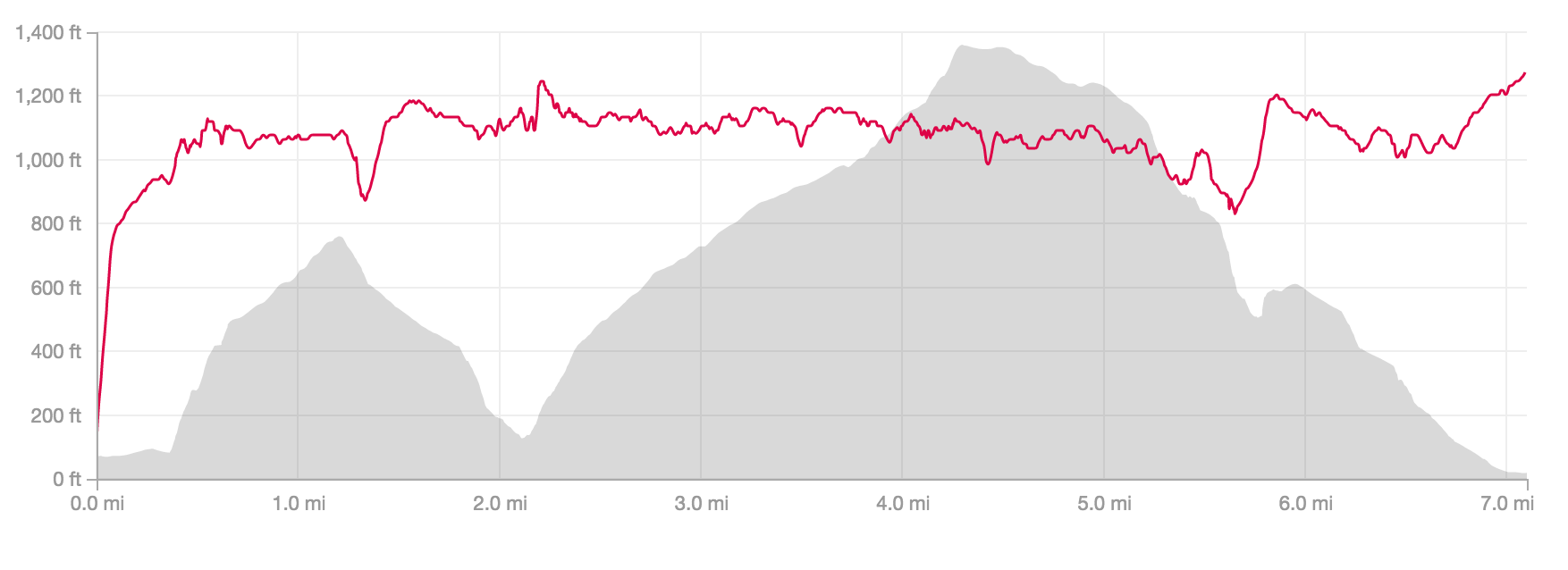 The next hill is the biggest. Remember those 40 stories of stairs at the beginning? That was half of the first hill’s climbing. This hill was twice as long and steep as the first hill. In total it was two miles that climbed 1,200 ft.