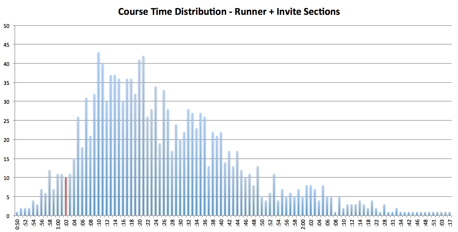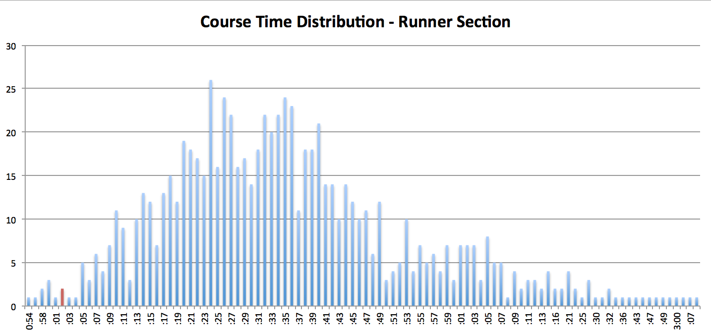 This is the distribution of race times for everyone in the runner section – those that didn’t qualify the previous year. I’m pretty close to the front, only a few people had faster course times, only one from the group I started with.