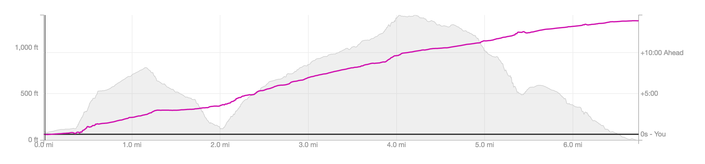 I love isolating the pace, look at that range – 3:20 per mile all the way to 22:20. I have never experienced so much variance in a single race. This was one of my favorite aspects of it and a big reason I’m looking more towards trail races in the future. Road races have become predictable – set your pace and hold it, then hope your energy systems don’t fail. There was a lot more to think about in this race including footing, passing strategy, optimal-though-not-even energy output, etc.