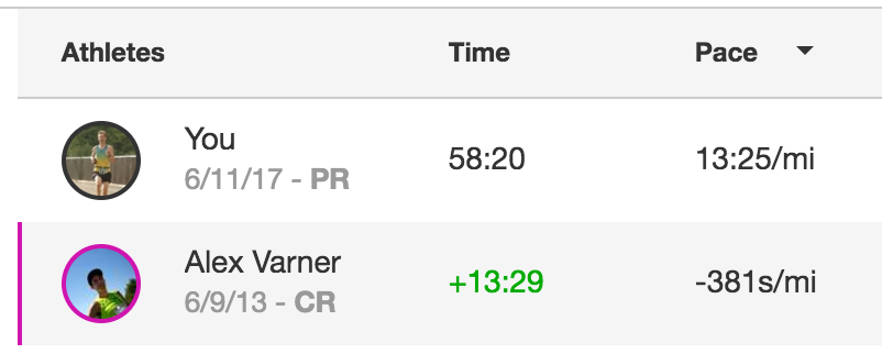 The Strava course record is held by the runner who has logged the fastest time each of the past few years. I compared my time to his to see if there were any sections I was weak at.