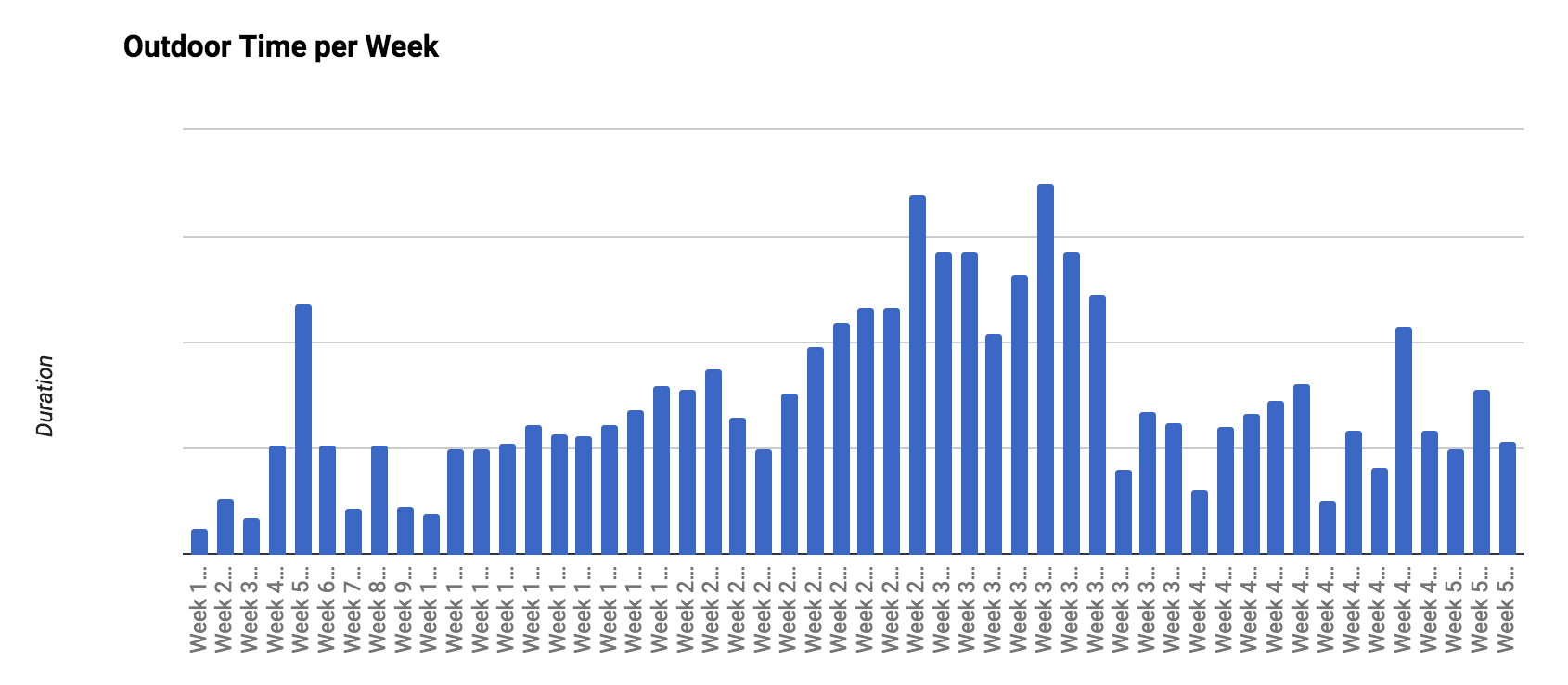 My habit for the year was to spend time outdoors with family, I was aiming for at least 7 hours per week. Over the course of the year 42 of the 52 weeks were successful. Of note, six of the ten missed weeks were in the first ten weeks of the year – meaning I got much better as the year went on. I actually averaged 10.25 hours outside per week which is about 50% more than 7 hours. The peak week was 24.5 hours.