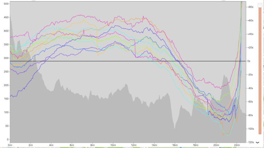 Here you can see how I was doing compared to a handful of other runners. When their colors are on top of the black line, it means they’re ahead of me. You can see I let a lot of people pass me in the first 13 miles and then over the next 6 I held my pace and gained a lot of ground. Unfortunately they all passed me very quickly come mile 22.