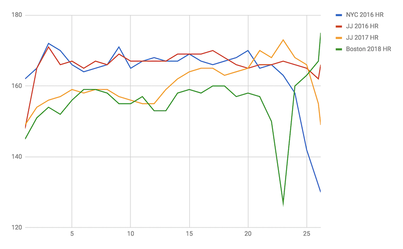 This is a chart of my heart rate per mile in all of the marathons I’ve raced. You can see that this race (in green) was the lowest I’d ever had my heart rate be for the early miles. Even lower than 2017’s Jack & Jill where I felt like I was jogging the first half.