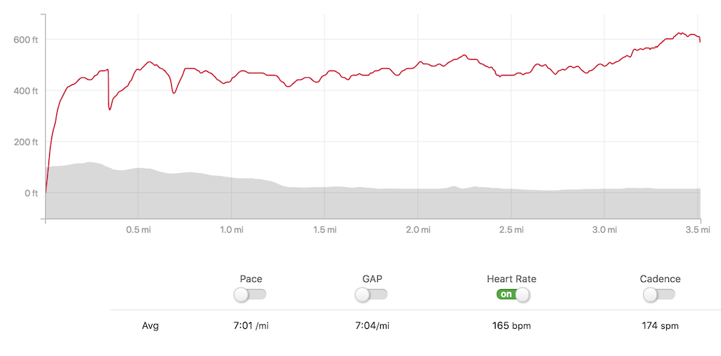 The next miles were 6:55 and then 7:11. I logged my highest heart rates of the day, mostly because I was now overheating in my layers. Kind of ironic – because I had been so cold earlier, because I chose NOT to wear layers, because I thought I would overheat.