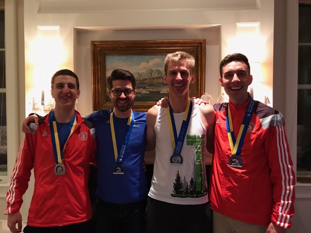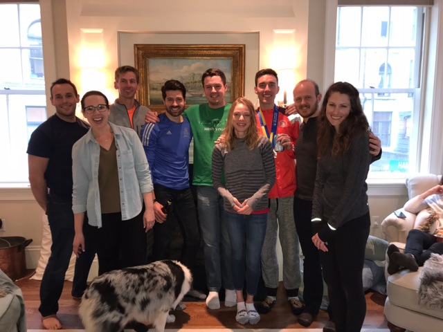 Next, we got together for a group picture and all put on our Boston gear we’d gotten that weekend. The other three runners I was staying with all held their medals. I didn’t have one, since I didn’t finish.