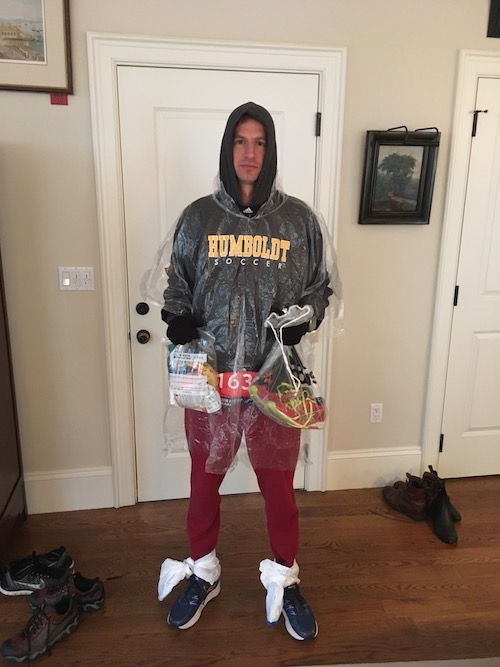 My strategy was to save as much energy as possible and start the race dry and warm. After eating my customary peanut butter bagel, I put on some throw away sweats, a poncho, stuffed bottles of near-boiling water into my pockets, put my socks into plastic bags and the into throw away shoes and carried everything else in a bag. I did some math and intentionally got on a bus two hours after I was supposed to. I ate a banana on the bus and when it dropped us off, I skipped the runners village and went straight to the start line, getting there before other runners and walking right up to a not-yet-used port-a-potty. It was well executed. Had I run well, I could attribute a lot of it to that.