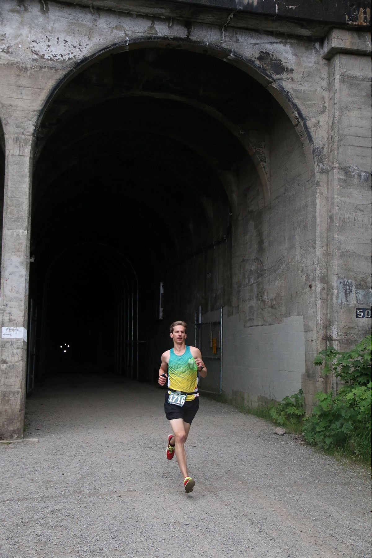 Half a mile into the Jack and Jill marathon, the course enters a tunnel. It is a 2.3 mile long, pitch black, perfectly straight, damp & cold, former train tunnel that is about 25 ft high and 12 ft across with a crushed rock floor. I have never run in anything like it (minus the test the day before).