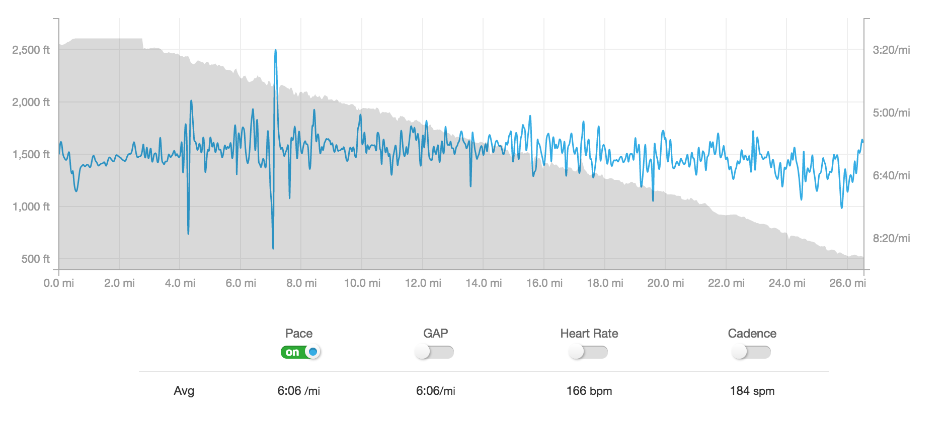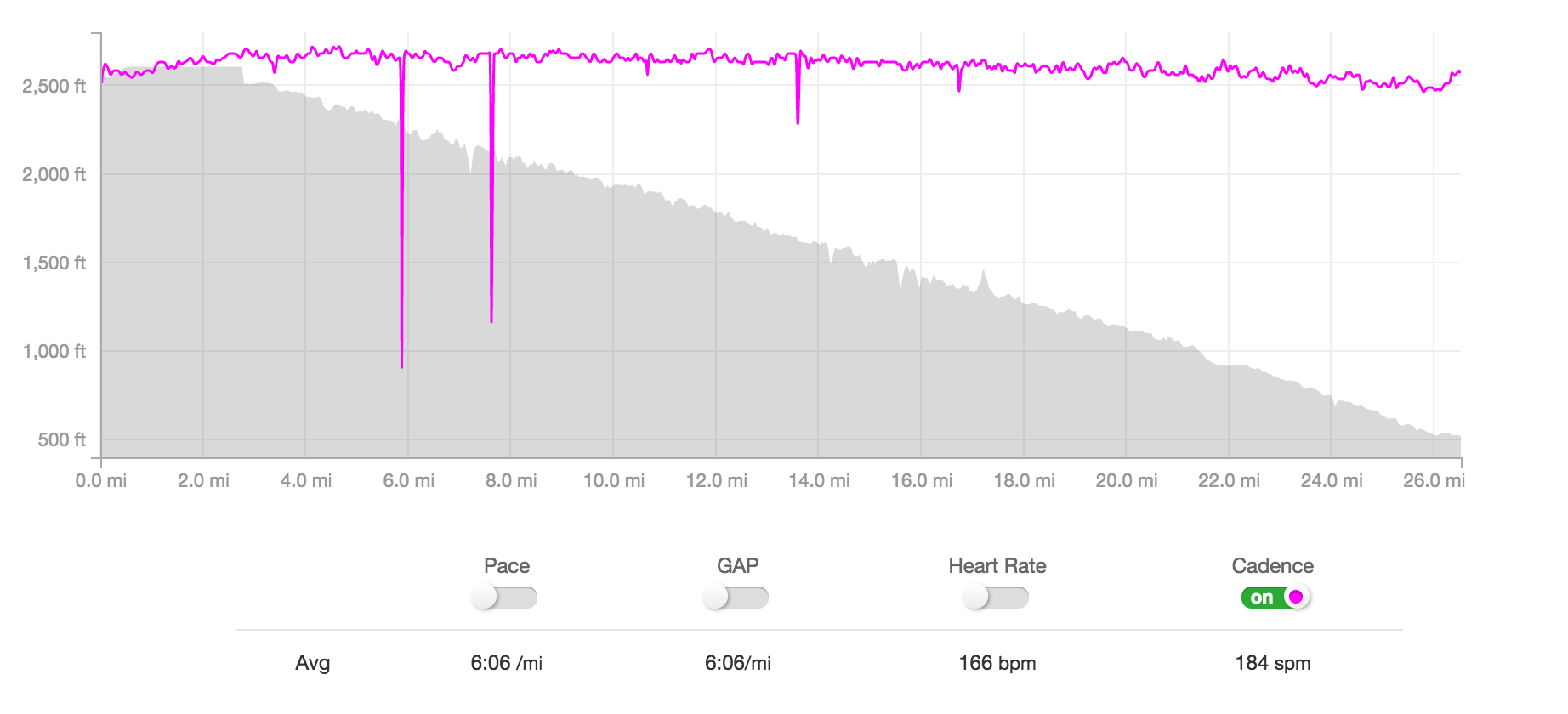 Because this race was downhill, I actually wanted to keep it around 190 because more steps means less impact on each step. The slower start is me not yet getting into my groove. The dips are me stopping to fill up my water bottle or pee. The slow decrease in cadence from mile 10 onwards is me becoming fatigued. I should have kept a better eye on that, focusing on keeping that higher might have shaved some time off my race.