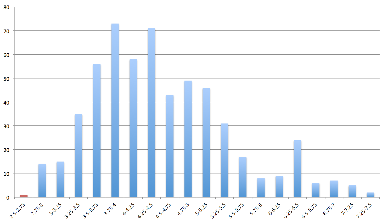 Really interesting to see that spike around 6.5 hours – I believe that was the cutoff, but it appears a few people snuck in afterwards. There is also a noticeable dip around 4 hours – perhaps a number pushed to get under the 4 hour mark.