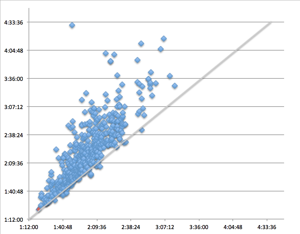 I’m the red dot below, my splits were 1:20:19 and 1:22:04. Pretty even – only 2% different.