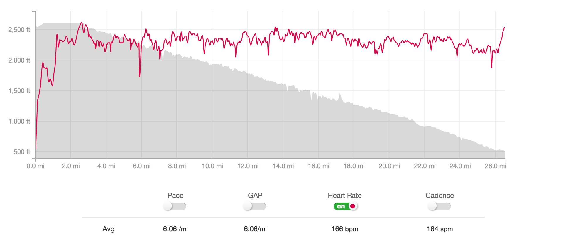 My goal in terms of heart rate was to stay under 165 until mile 10 to save energy. After that, stay on pace but allow up to 170. At some point I would make the call to go all out and do whatever it took to finish – likely putting me in the 170s until the last mile where it would have been 180s.