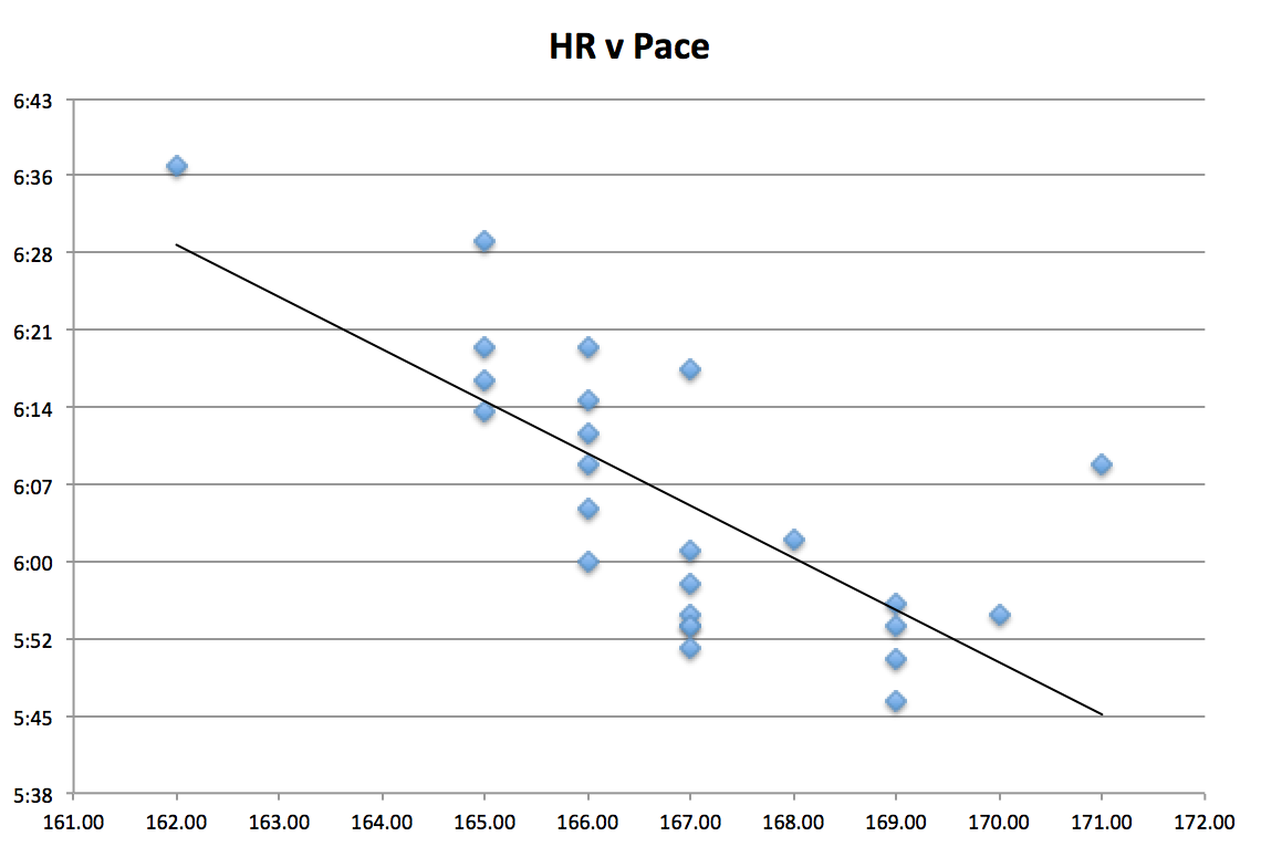 Here I charted my pace and heart rate from mile 2 to 26 and what we can see is a nice linear chart. Regardless of while mile, my heart rate on any given mile correlates really closely with my pace.