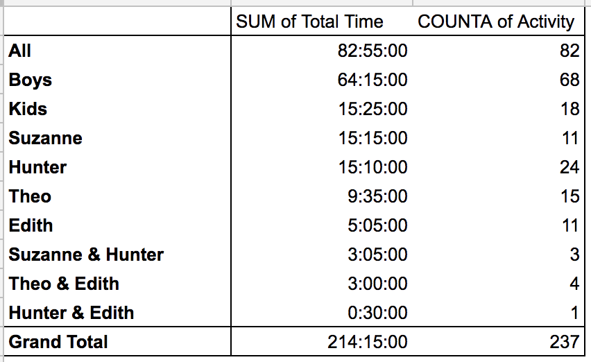 Looking at who within the family I spend outdoor time with – there were a few notable shifts.