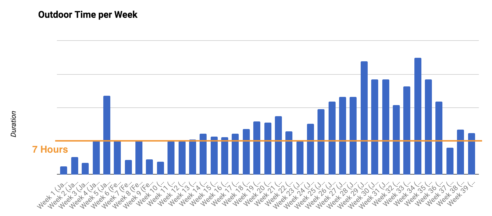 In fact, my peak week hit 24.5 hours. Meaning I spent greater than one full day of that week outside. The average over the quarter was 16.5 hours, which is more than double the goal time of 7 hours. I only missed on one week and that was due to me being away from family for four days as I drove our van across the country. I might even have been able to hit the time in just 3 days if I hadn’t been so busy packing for said move.