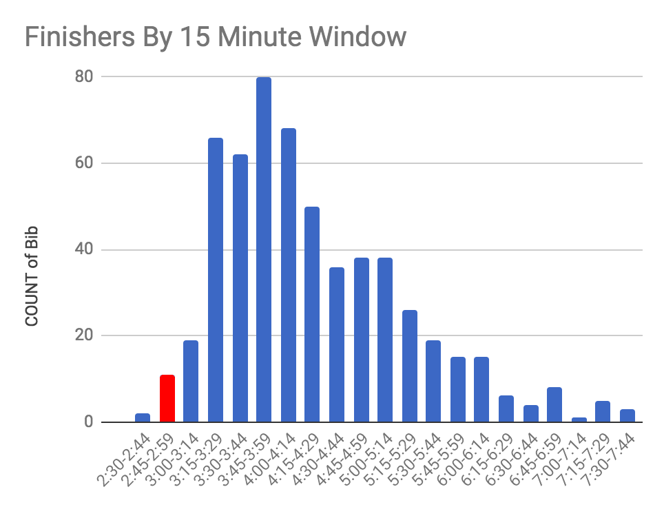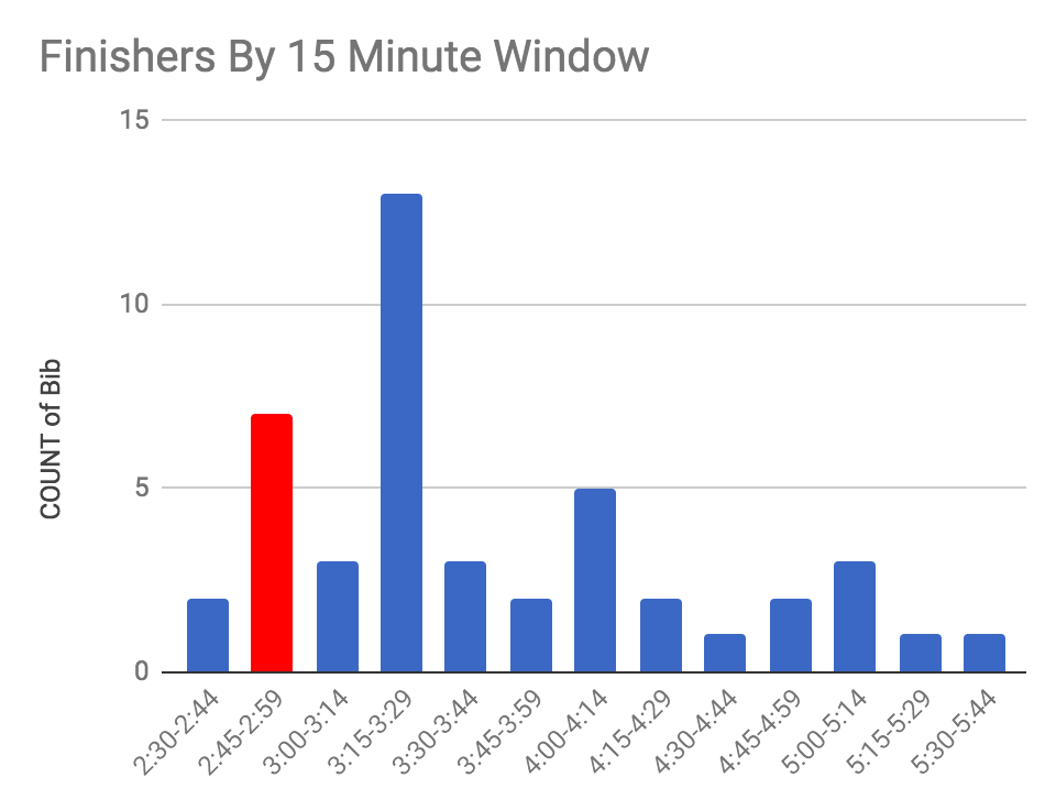 If we filter to just young males, 34 and under specifically, the results are a little less pronounced. Part of the reason the red bar is so high is our group of 3 who showed up together to turn in that time. The BQ time for these age groups in 3:05 – about 12 of the 45 finisher got it, which is really high. Its a fast course thanks to the continual slight elevation drop.