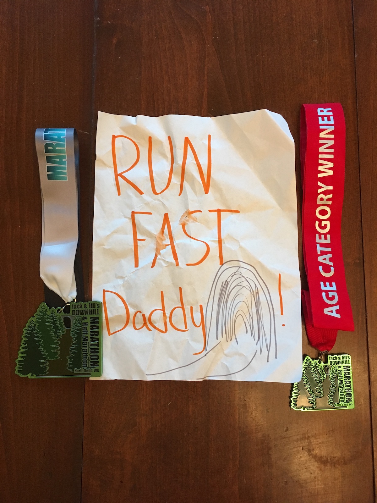 Most races give our participant medals to every finisher – it is always nice when you walk away with an age group medal as well. Funny enough those always tend to be the smaller ones. That middle award is my favorite though. Half of my training runs had the stroller in tow and my boys’ favorite thing to yell was ‘go faster daddy’. I’m so happy they could see me in the race and be a part of that.