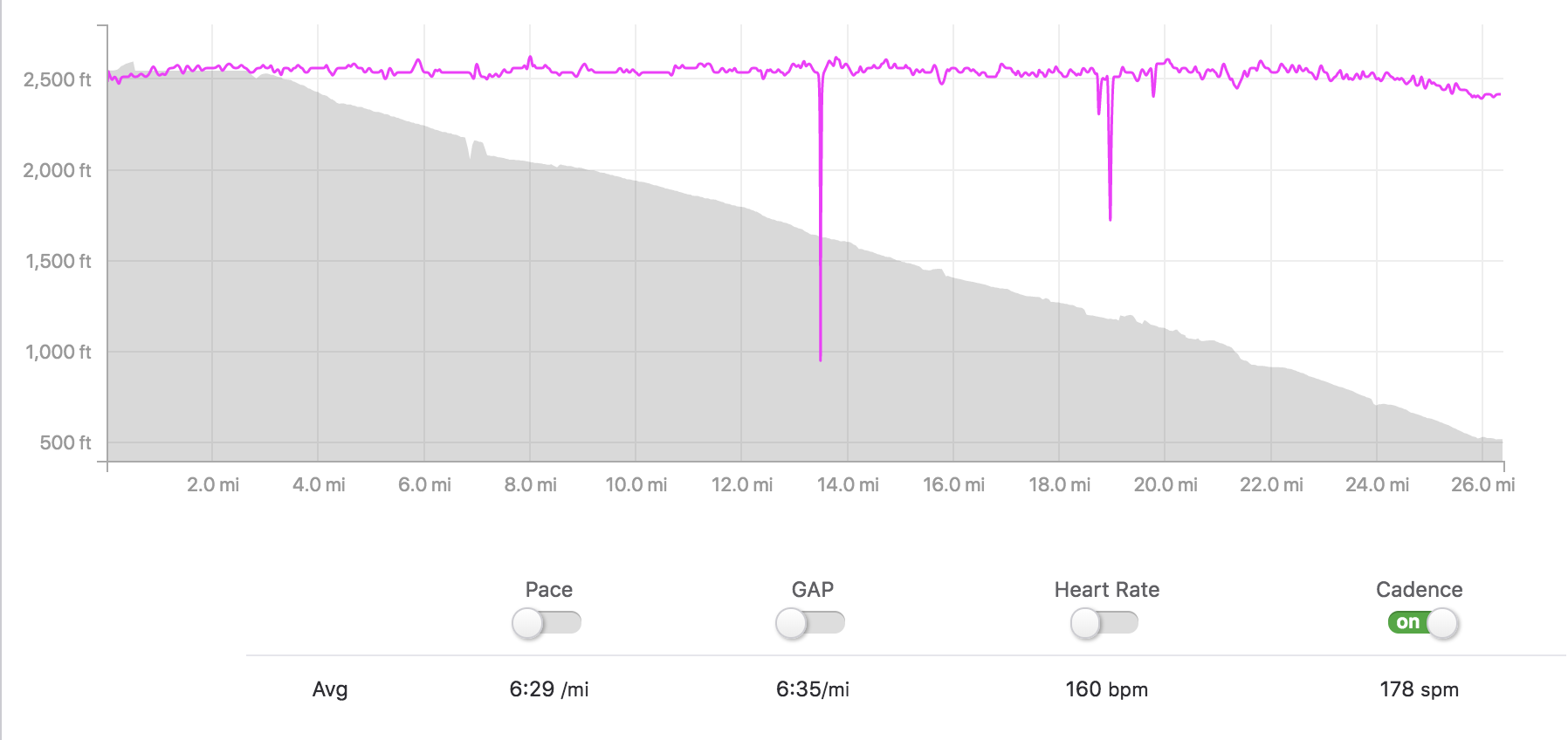 My cadence, how many steps I took per minute, was low early on as we started off at such a slow pace. It got up to speed around mile 3 though and stayed relatively consistent until mile 22, minus a stop during mile 13 to pee and a longer water bottle fill up around mile 19. In the end my cadence was dropping, despite my focusing hard on keeping it up, my legs just turned into bricks.