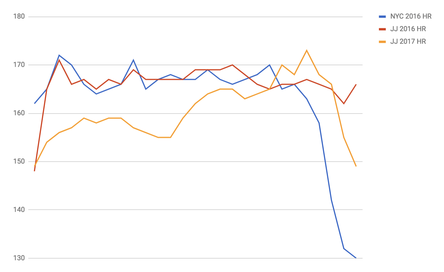 This next chart is my heart rate per mile in all of my marathon races. You can see the red line which is last year’s Jack and Jill, the race I won, is fairly consistent, with a slight drop in the latter miles but a strong finish. New York in blue started off higher in the first few miles, remained high and then crashed huge.