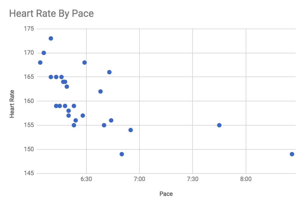Here you can see a scatter plot of my heart rate and pace for each mile of the race. Generally these follow a trend where the faster you are going the higher your heart rate is. Usually due to exhaustion, the latter miles are a bit slower, even at the same heart rate.