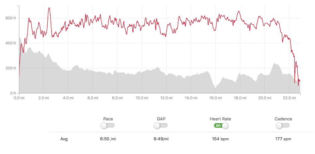 My heart rate through the fist half was incredibly low due to the cold. That gray line labelled 600ft in the chart below is actually 160 BPM. I barely crossed it where as normally I am at 165+ for most of a marathon.