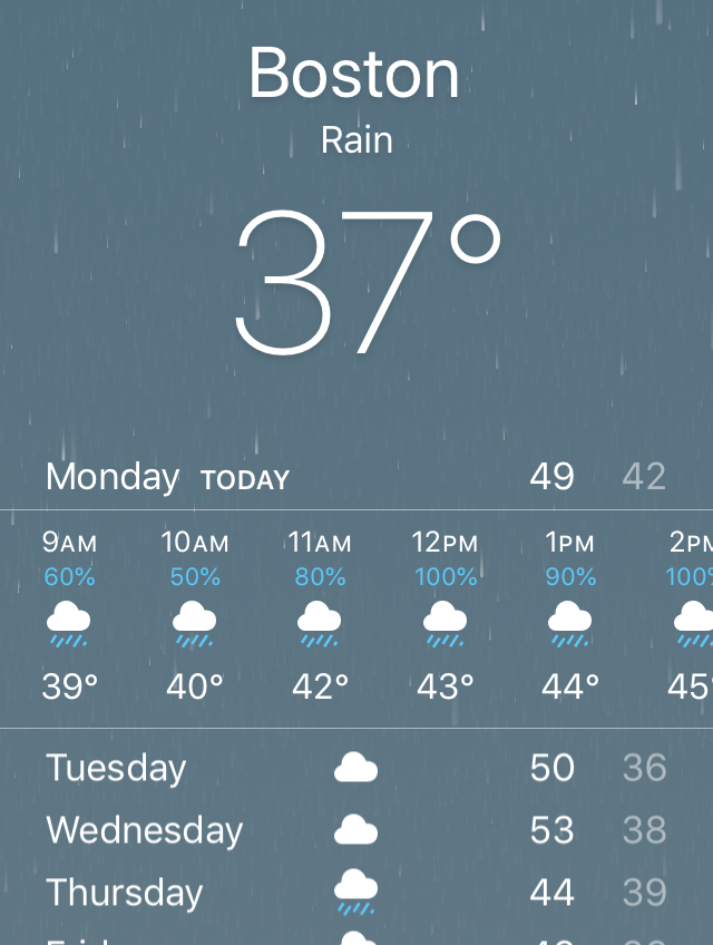 The weather reports had predicted rain a few weeks out. You never know how these things can change though. From everything I’ve heard, Boston in the spring can bring anything and change often.
