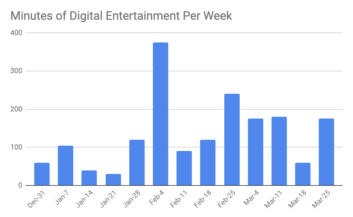 This habit has started out strong. I stayed under the threshold for 11 of the 13 weeks and my average so far is 2.27 hours of digital entertainment per week.