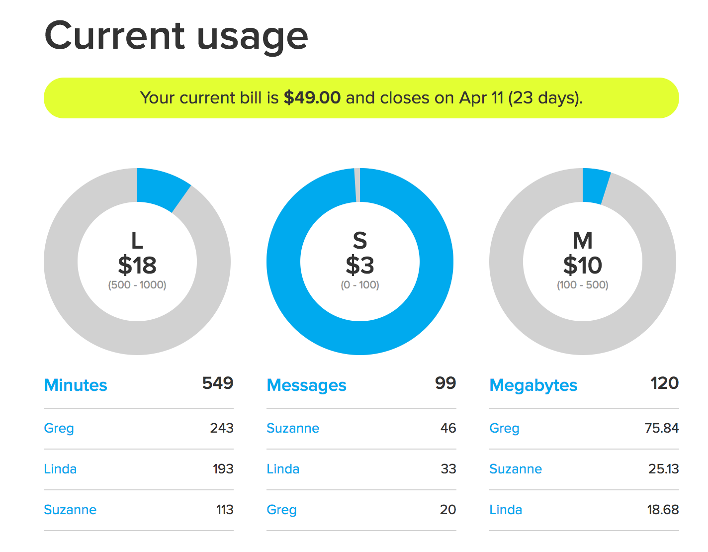 Here is a screen you can use to see your usage during the month. Along with total usage in each of the three categories they charge for, you can see how much each person is using.