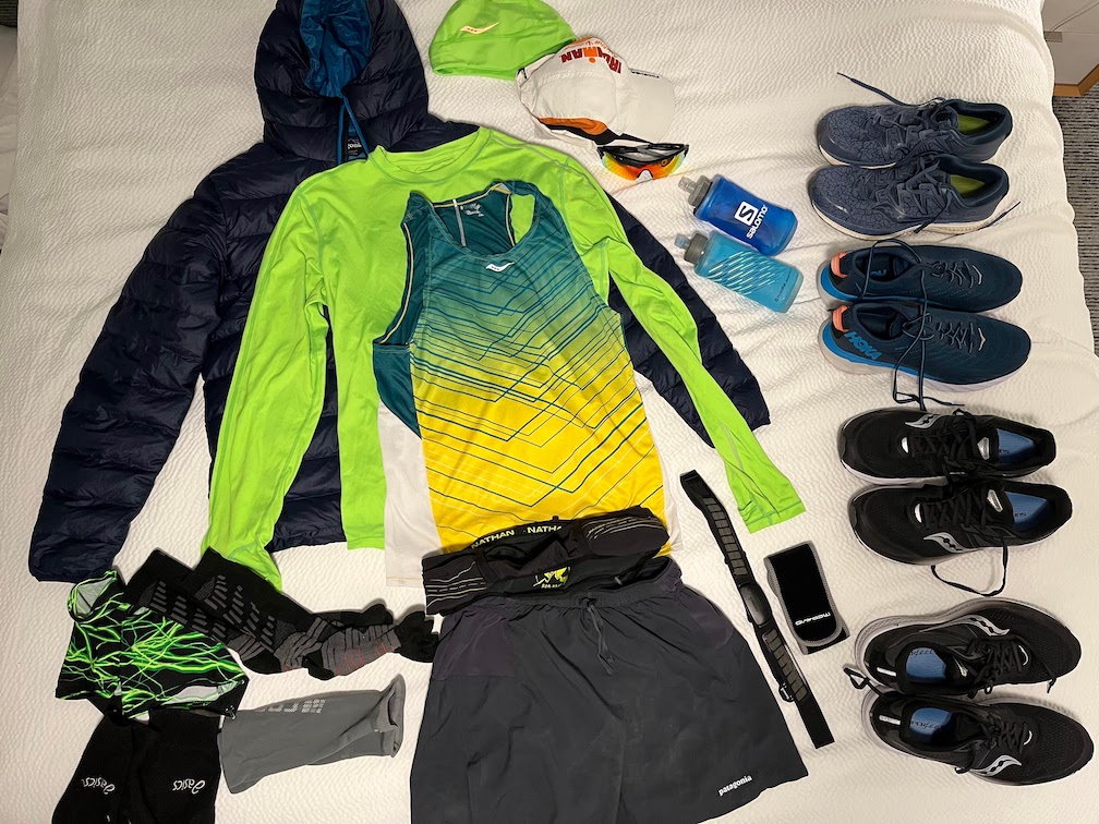 My gear was basically just my standard stuff. I found it funny how well my things matched, this is not by design. I guess I just pick a lot of green and gray/black things. This setup pretty well sets me up for any pace or temperature, tank top for the hottest, long sleeve if the temp drops to cool and then down jacket for anything lower than 50s. I also had four pairs of shoes and planned to switch every 6 hours as the midsole foam got compressed.